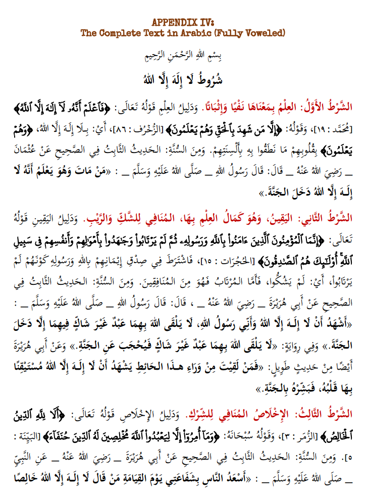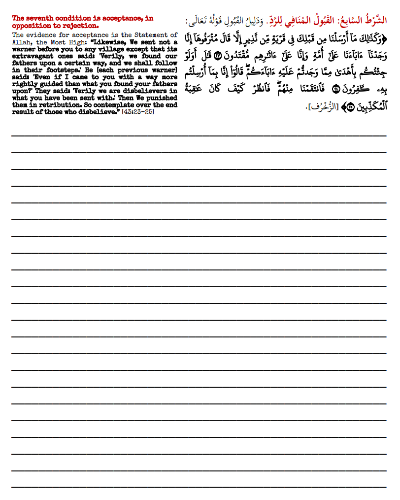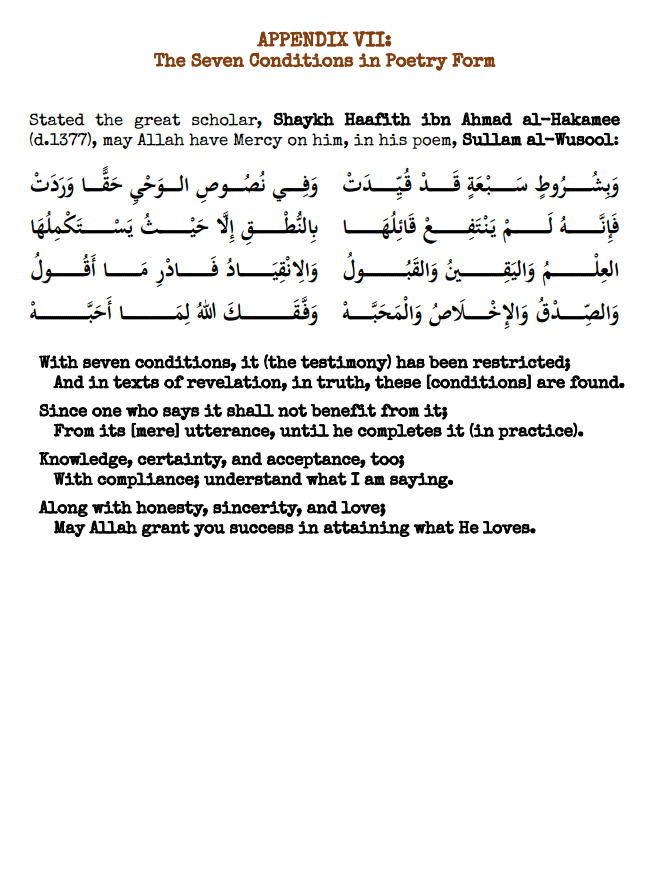 - In this valuable set of resources, you have the entire Arabic text of the book, paired with a clear English translation, laid out with ample space for notetaking during classes. After the text there are other helpful resources, including the uninterrupted text, in its original Arabic (both voweled and unvoweled), as well as its uninterrupted English translation. A chain of transmission is also included, as well as quizzes to check one’s basic understanding of the text. An answer key is provided on the bottom of page 3. The seven conditions are also presented in poetry form, from the book, Sullam al-Wusool, by Shaykh Haafith al-Hakamee (may Allah have Mercy on him).