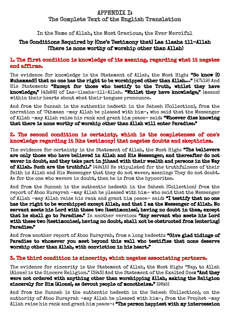 - Summary: In order to clarify the meanings and requirements of the Muslims’ testimony of faith, Shaykh al-Islam Muhammad ibn ‘Abdil-Wahhaab (may Allah have Mercy on him) penned a short explanation of the topic called, “Shuroot Laa-ilaaha-ill-Allah,” or: The Required Conditions of the Testimony of Faith. These conditions mentioned and explained by Shaykh al-Islam Muhammad ibn ‘Abdil-Wahhaab (may Allah have Mercy on him) can be summarized as follows: [1] Knowledge, [2] certainty, [3] sincerity, [4] honesty, [5] love, [6] compliance, and [7] acceptance.